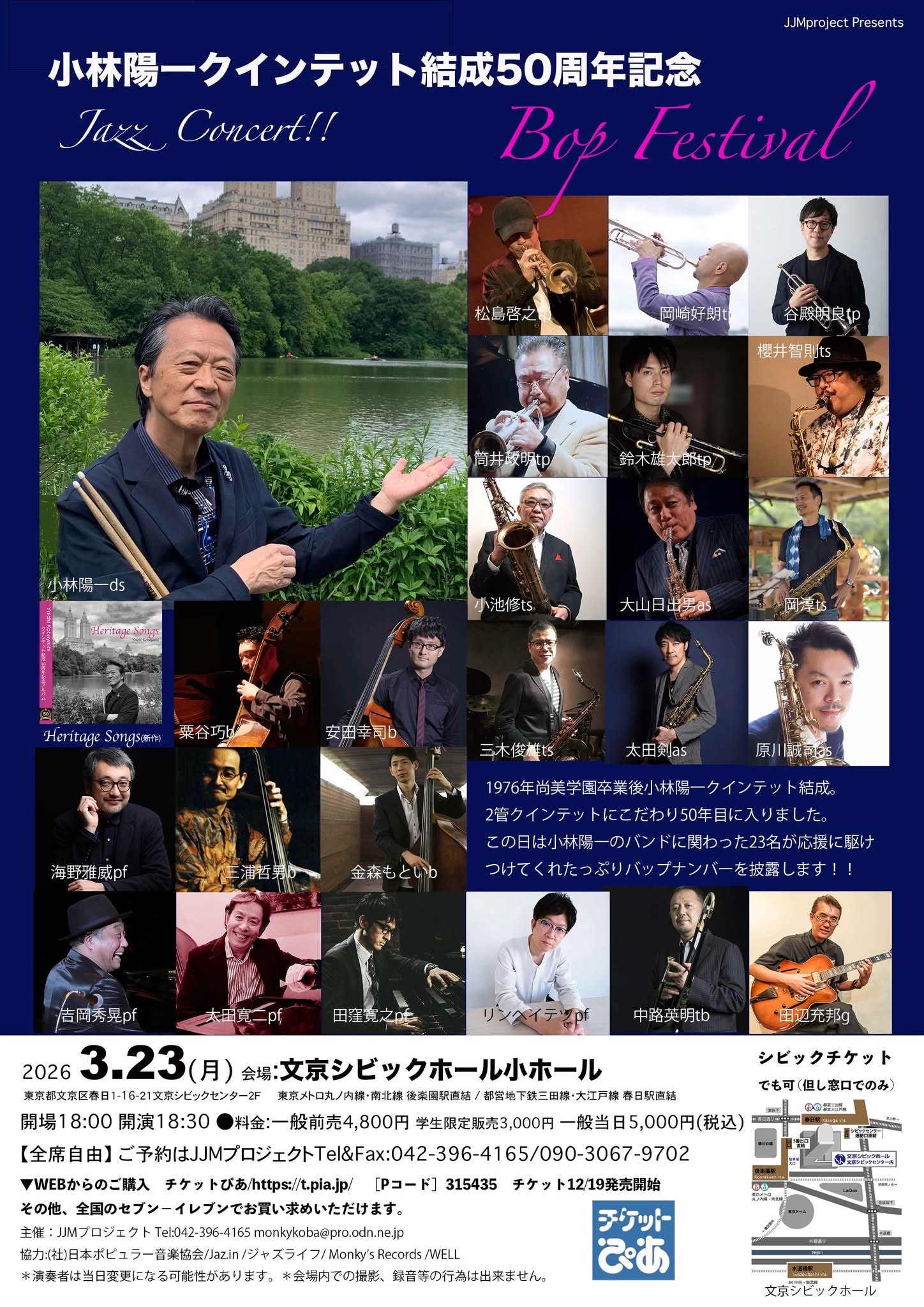 | 3/23(月) | 文京 文京シビックホール 小ホール 小林陽一クインテット結成50周年記念ジャズコンサート 小林陽一のクインテット結成50周年を祝って このバンドに携わったメンバー23名がバップナンバーで共演します。 チケット等詳細はコチラ |